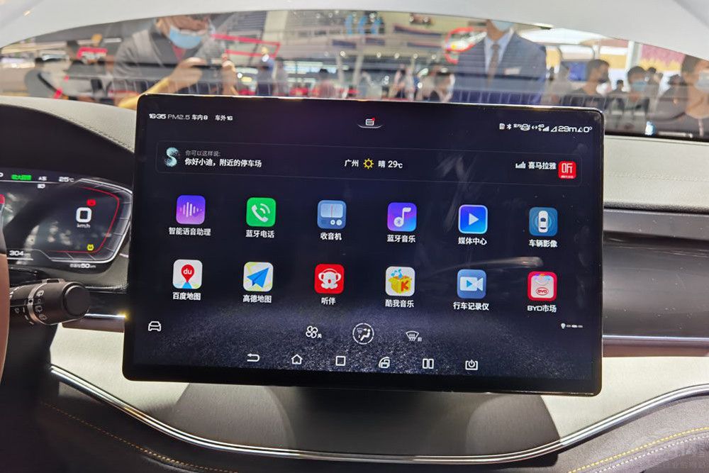 比亚迪唐新能源的内饰设计重点突出科技感。坐进唐新能源的车内,首先映入眼帘的是超大尺寸的中控屏幕,买车送笔记本电脑也不过如此,中控屏幕的分辨率很高,UI设计年轻时尚,更重要的是,这款屏幕可以做自适应旋转,满足不同驾驶情况的需要。