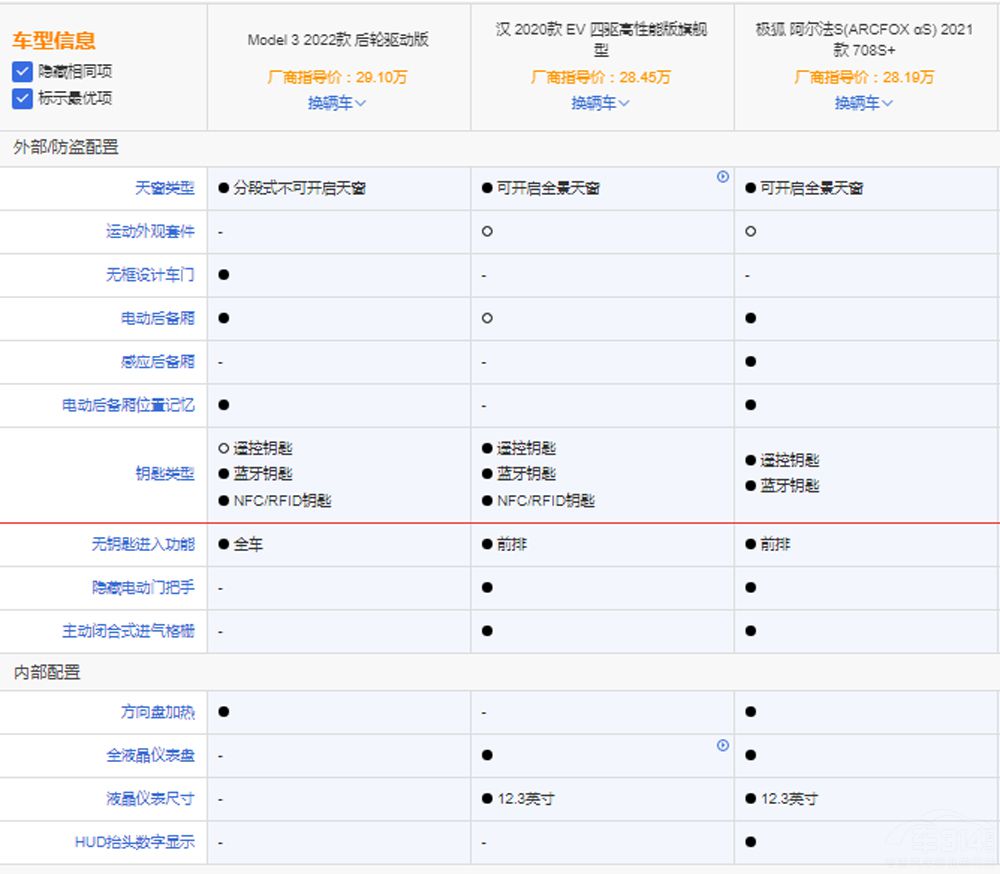 为更直观对比我们选取了28.19万元的极狐阿尔法S,28.45万元的比亚迪汉EV 四驱高性能版旗舰型和29.0988万元的Model 3后轮驱动版来进行对比