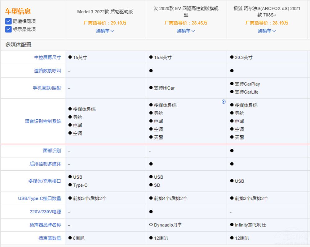多媒体方面极狐阿尔法S像道路呼叫救援,后排多媒体控制,面部识别,Car Play,Car Life,品牌音响,都有配备。汉EV有220V电源,Hi Car,Model 3垫底。