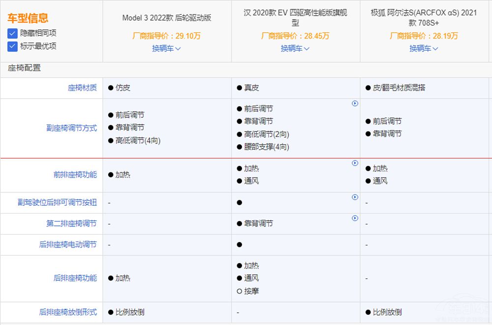 小结:汉EV在车身长度和轴距方面占优,极狐阿尔法S则在宽度,高度方面有优势,Model 3则完全被超越,汉EV在座椅方面配置最高,因此其乘坐舒适性也是最好的。