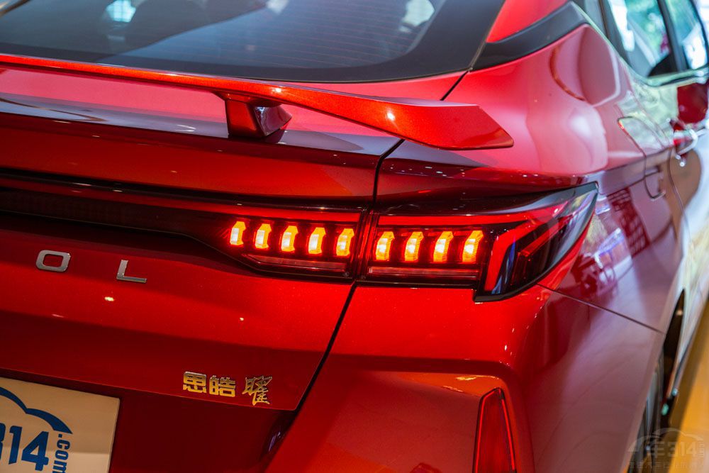 思皓曜的外观设计最大亮点在于层次分明的车头设计,上中下三层设计营造出极强的时尚感和运动感。大灯细长且棱角分明,辨识度比较高。黑化后的轮毂与红色刹车卡钳的搭配,营造出极强的运动感。贯穿式的尾灯设计,夜间点亮时的辨识度极高。