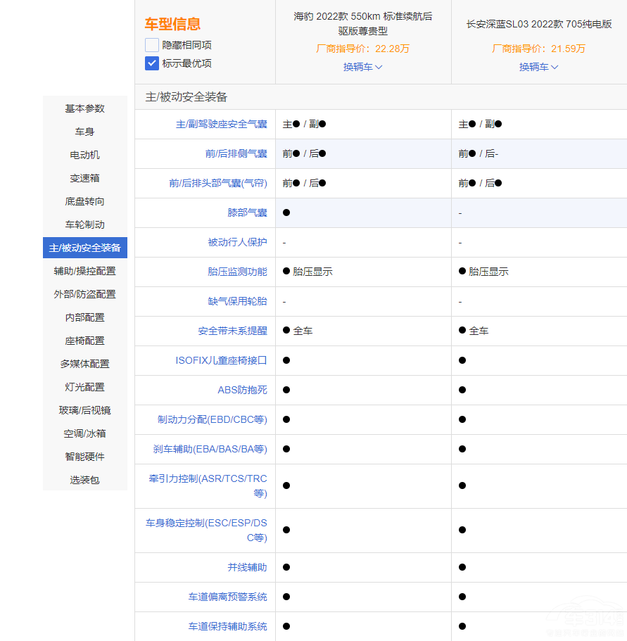 在主被动安全配置方面,比亚迪海豹独有膝部气囊、后排侧气囊和车道居中保持,长安深蓝SL03独有疲劳驾驶提示。