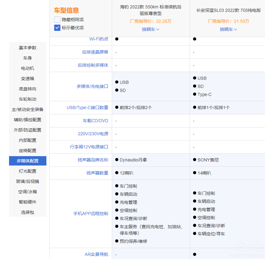 在多媒体配置方面,长安深蓝SL03独有手势控制、面部识别、AR实景导航等,比亚迪海豹独有5G网络。