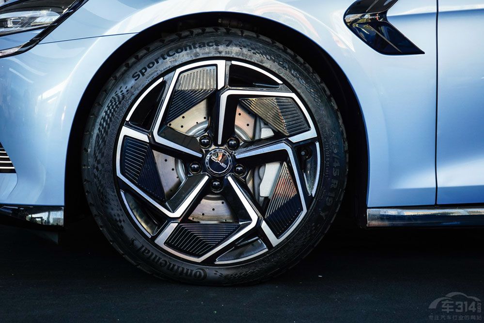 车身同样采用了隐藏式门把手,熏黑翼子板造型很具张力,拼色花瓣状轮毂动感十足。