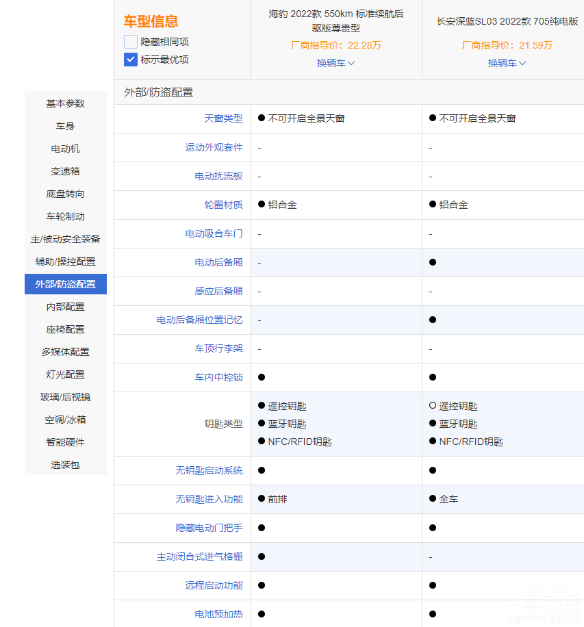 在外部/防盗配置方面,长安深蓝SL03独有电动后备厢、后备厢位置记忆和全车无钥匙进入,比亚迪海豹独有遥控钥匙。
