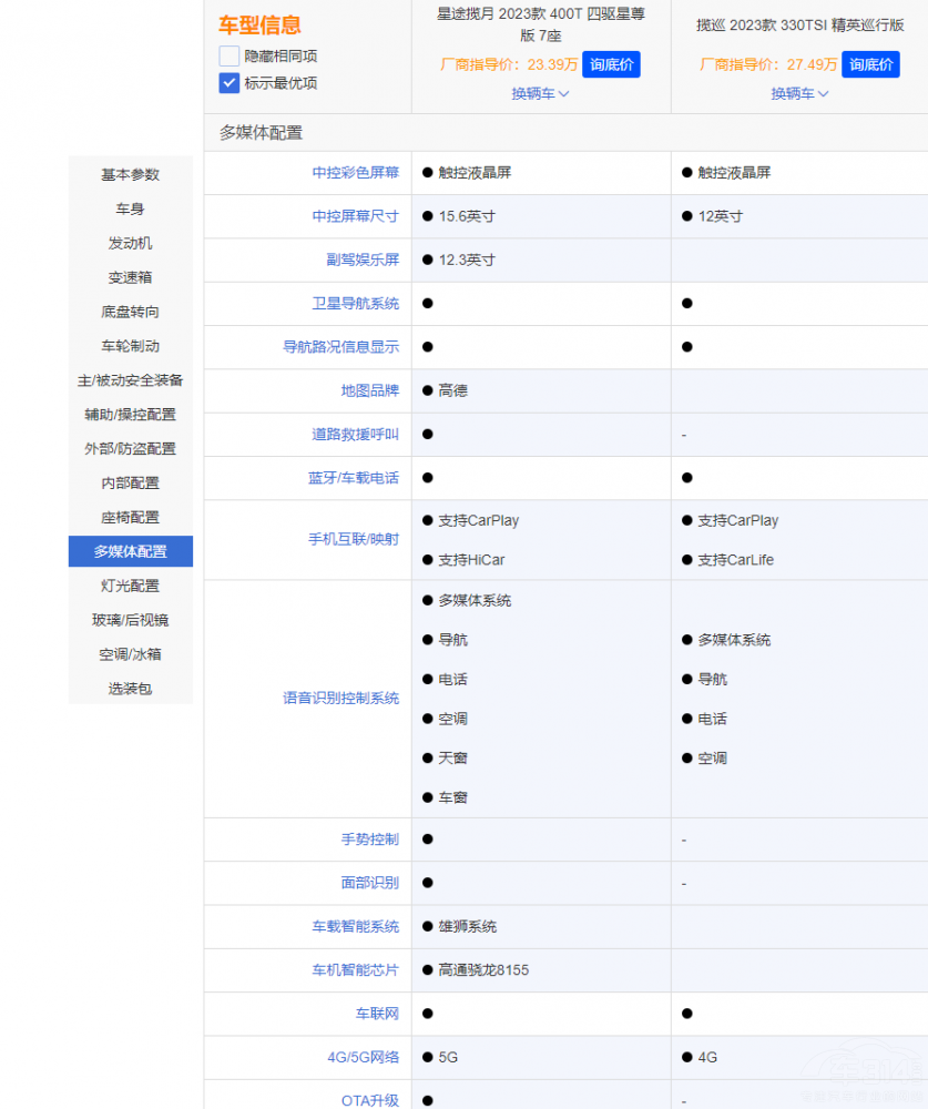 在配置方面,我们选取了两车价格差别最小的大众揽巡 2023款 330TSI 精英巡行版(指导价:27.49万)和星途揽月 2023款 400T 四驱星尊版 7座(指导价:23.39万)进行对比,看看谁的配置更加丰富。