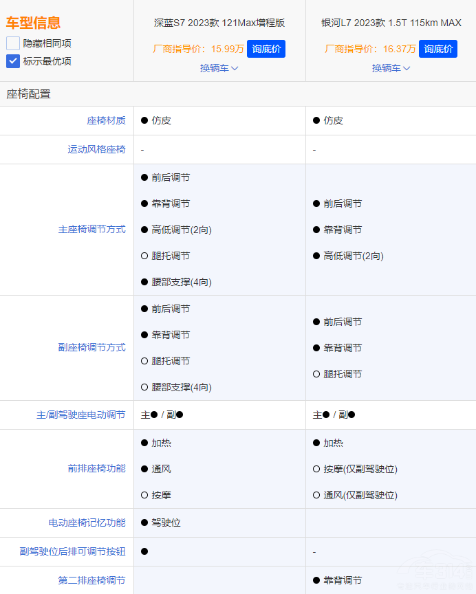 在座椅配置方面,深蓝S7独有主座椅腰部支撑、前排座椅通风和驾驶位电动座椅记忆功能,吉利银河L7独有第二排座椅靠背调节。