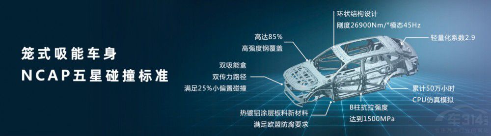 得益于全新笼式吸能车身技术,星途瑶光在碰撞安全上可满足全球N-CAP五星标准。全车高达85%的高强度钢覆盖,B柱等关键部位使用1,500Mpa超高强度热成型钢,更独有“双吸能盒、双传力”路径的设计专利,能更好地吸收、分配碰撞产生的冲击和能量,满足最为严苛的25%小偏置碰撞测试标准。