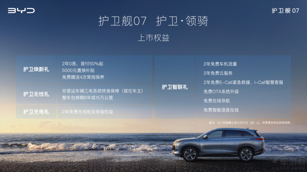 2022年12月9日,比亚迪海洋网全新大五座超混SUV——护卫舰07正式上市,新车共6款车型、5种颜色,综合补贴后售价20.28万元-28.98万元。通过深度捆绑DM-i超级混动技术,护卫舰07实现了最高205km的纯电续航和超过1200km的综合续航,为新生代家庭用户带来“通勤可纯电、远行亦从容”的全场景出行自由。