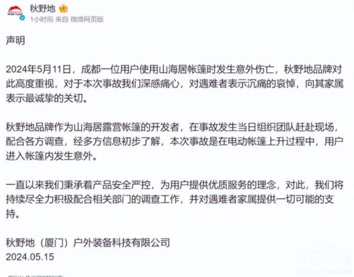 另一个就是最近刚发生的,成都一位长城炮车主在使用山海居车顶帐篷时,因发现帐篷关不严所以探头查看,导致被机械部件卡住脖子不幸身亡。于是车主家属质疑长城炮存在安全隐患,而长城炮也在一片网友们的声讨中,登上了社交媒体热搜。
